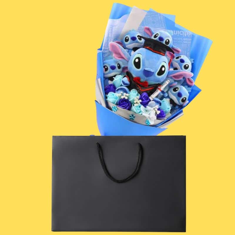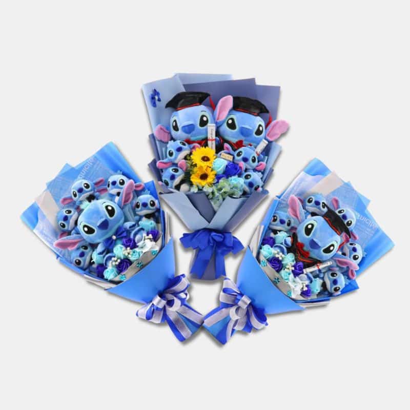 Chaque peluche Stitch arbore son sourire espiègle caractéristique, apportant joie et réconfort. Les fleurs artificielles ajoutent une touche poétique à l’ensemble.