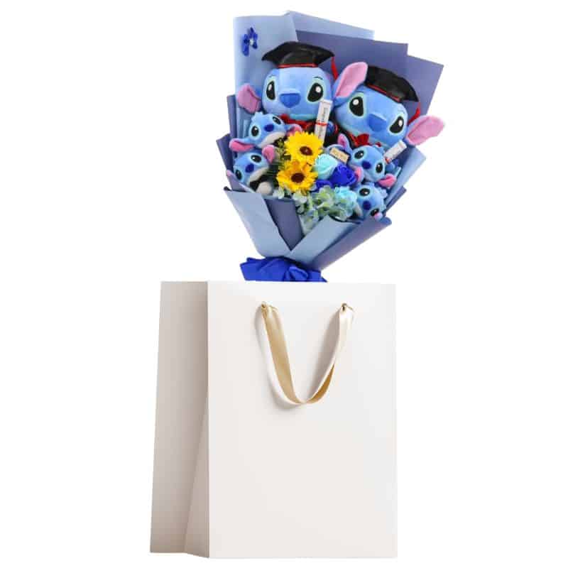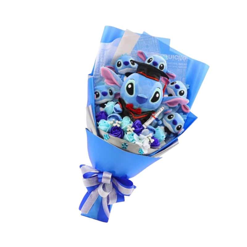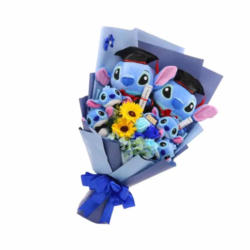 Cette ravissante composition rassemble des peluches Stitch de 20 à 46 cm arrangées avec soin dans un ensemble floral d’environ 48 cm de hauteur. Ornée de fleurs artificielles délicates, elle convient parfaitement aux anniversaires et moments tendres. Les doudous moelleux aux expressions attachantes créent une surprise mémorable qui enchantera petits et grands.
