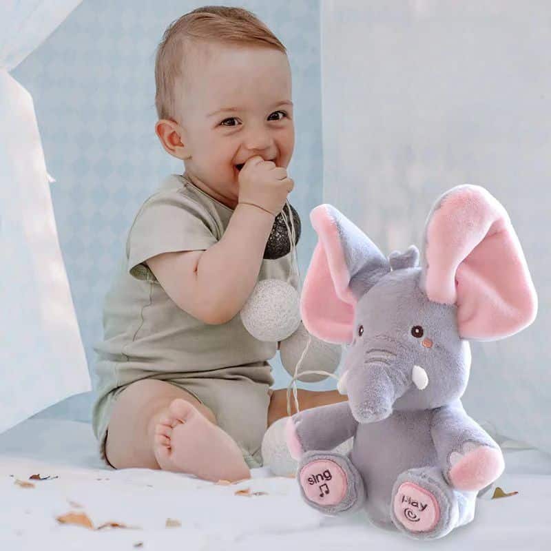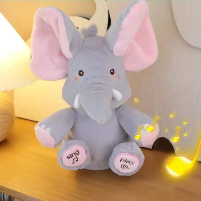 Cet adorable éléphant musical de 30 cm devient le compagnon préféré des tout-petits grâce à sa texture veloutée et sa berceuse relaxante. Sa taille parfaite permet aux petites mains de le saisir facilement pour des moments tendres. Un ami câlin qui accompagne les rêves de bébé avec sa douce mélodie.