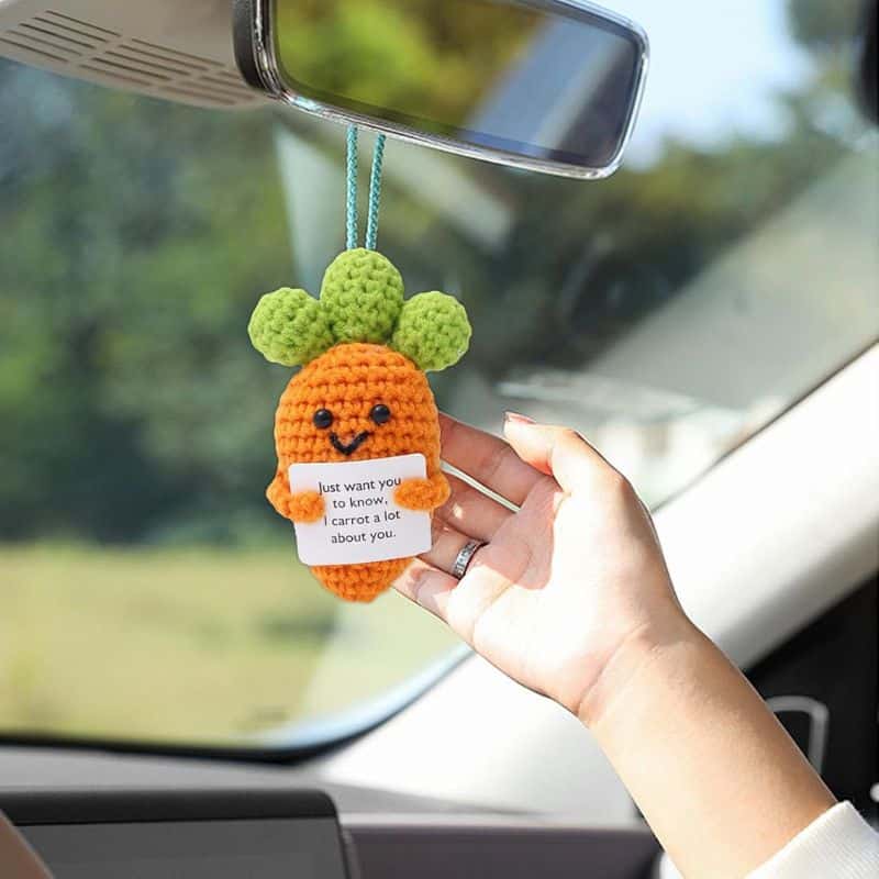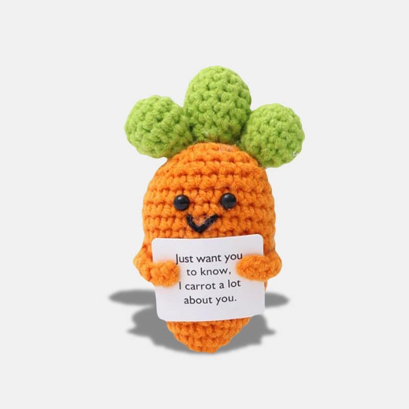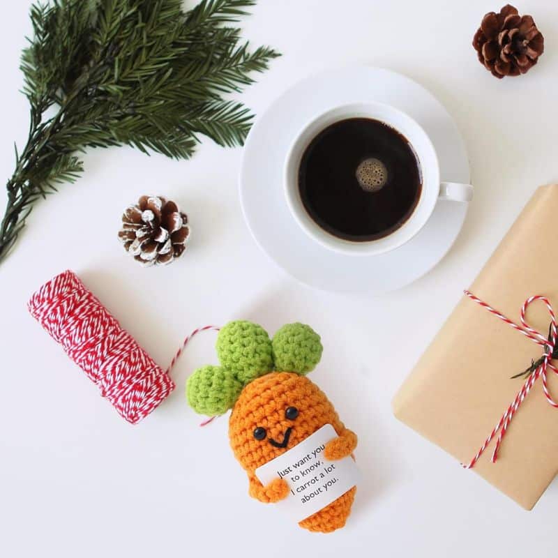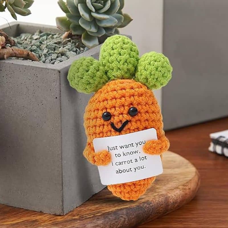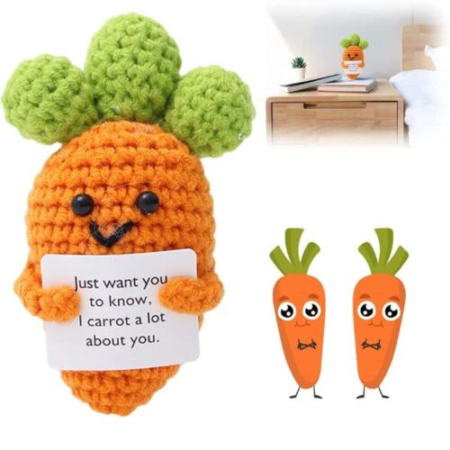 Cette charmante carotte au crochet de 11,5 cm ravira petits et grands avec son message plein d’humour. Son orange lumineux et ses feuilles vertes texturées créent un contraste délicieux. Les petits yeux brillants et le sourire brodé lui confèrent une expression attachante. Entre ses petites mains tricotées, une pancarte révèle ces mots tendres : « Je veux juste que tu saches, je carotte beaucoup de toi ». Un cadeau original pour célébrer l’amitié ou l’amour avec légèreté.