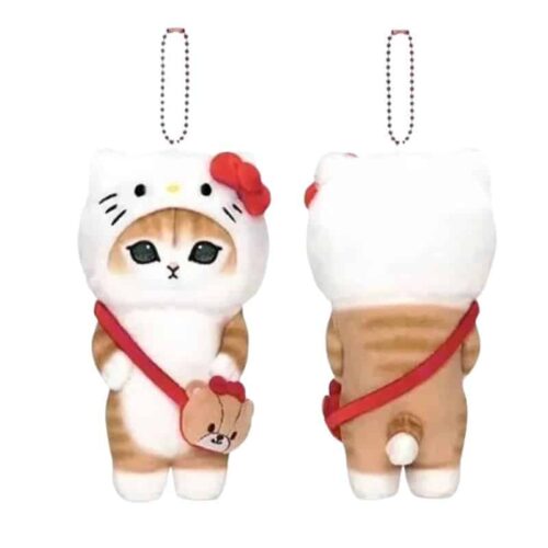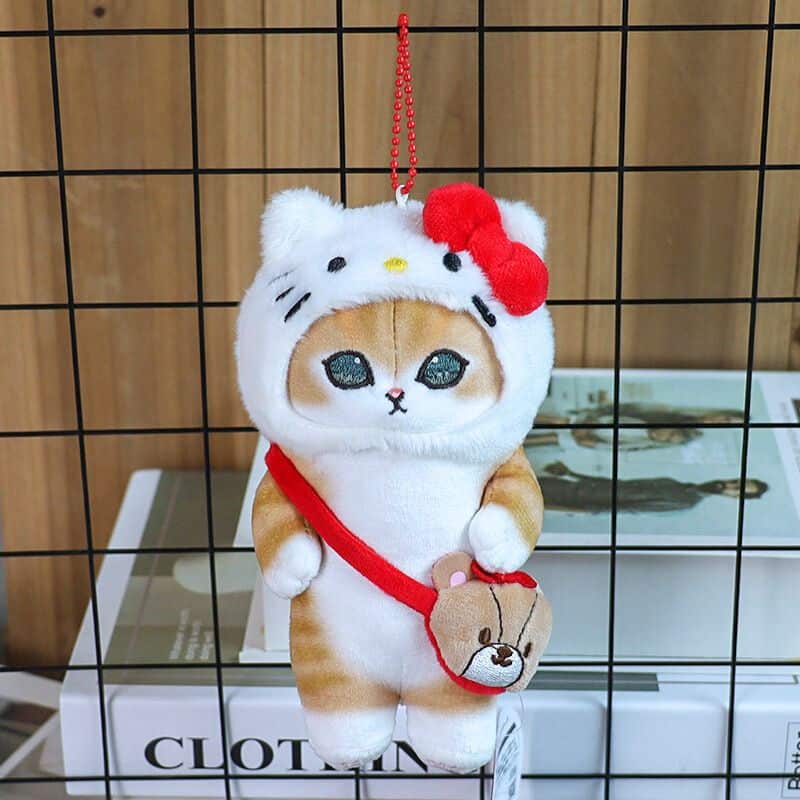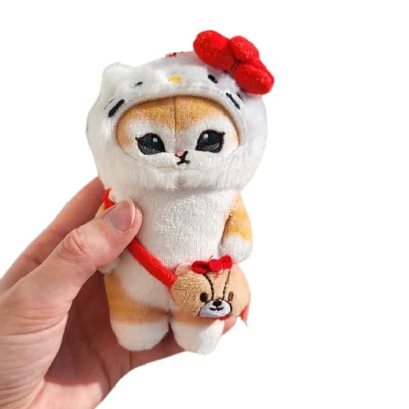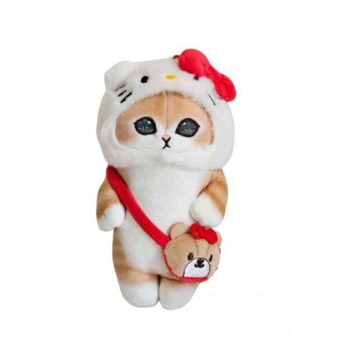 Ce ravissant chat déguisé en Hello Kitty apporte douceur et fantaisie dans l’univers des petits. Son costume blanc immaculé, agrémenté d’un joli nœud rouge, et ses yeux pétillants font craquer tous les cœurs. Mesurant 18 cm, cette peluche kawaii s’accompagne d’un mini sac coordonné pour encore plus de charme.