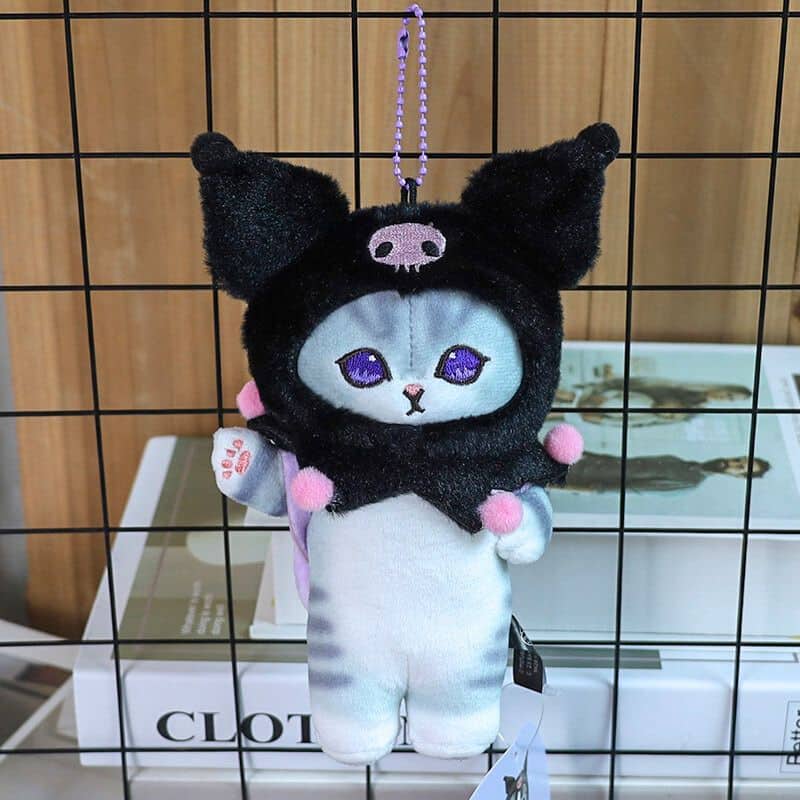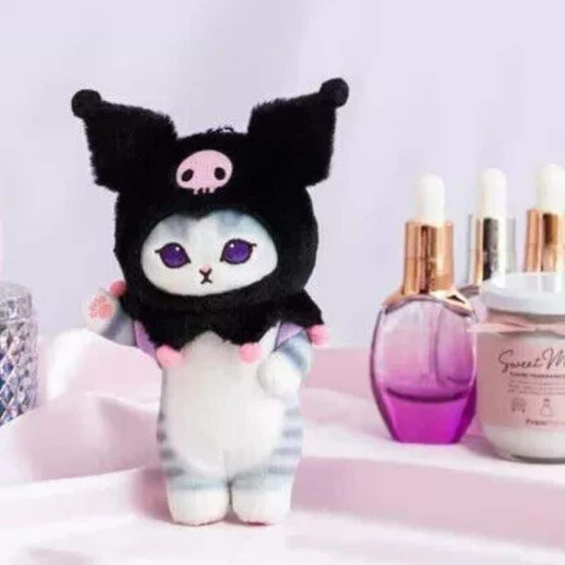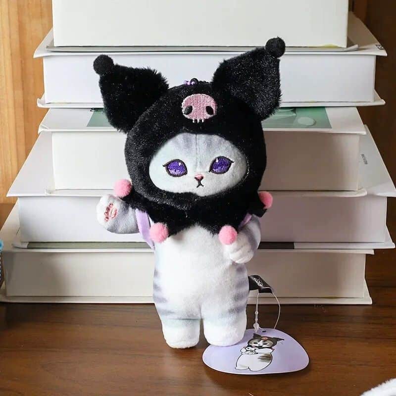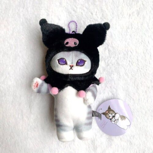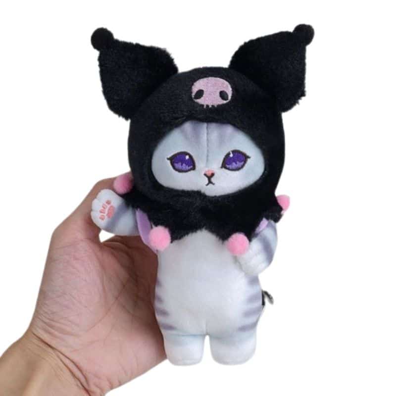 Découvrez ce ravissant chat en peluche habillé en Kuromi, un compagnon adorable inspiré de l’univers Sanrio. Ses yeux violets brillants et son déguisement noir décoré d’un crâne rose lui donnent un charme espiègle unique. D’une hauteur de 18 cm, cette peluche toute douce trouve parfaitement sa place sur un bureau ou dans les bras de votre enfant. Les pompons roses ornant son col apportent une note fantaisie supplémentaire à ce doudou câlin.