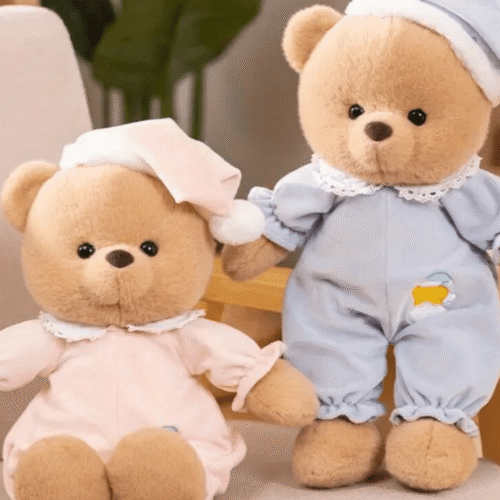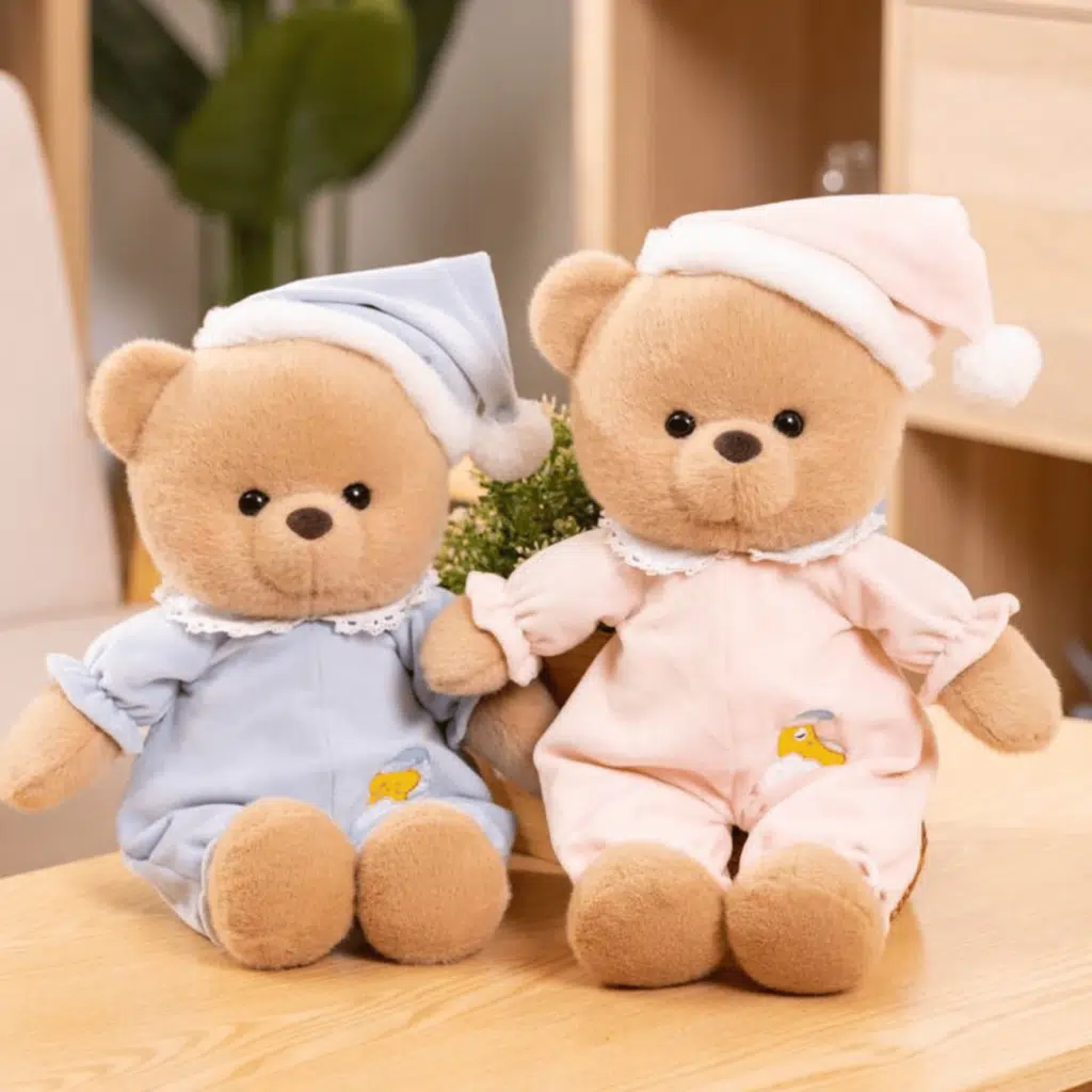 Cet adorable ours en peluche habillé d’un pyjama accompagne tendrement les moments de repos des petits. Proposé en 40 cm de hauteur, vêtu d’un pyjama bleu ou pyjama rose, il est fabriqué en tissu ultra-doux et hypoallergénique. Sa texture moelleuse invite aux câlins apaisants qui réconfortent à l’heure du coucher.